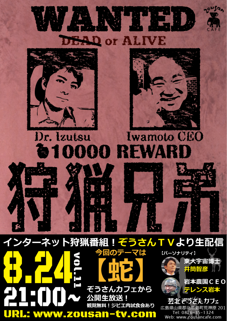 8月24日(水)夜9時からは、ぞうさんTVより狩猟トークライブ『狩猟兄弟』を生放送!今回のテーマは「蛇」